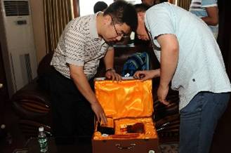 百度領(lǐng)導(dǎo)帶來的寓意深遠的精美禮品在贈送儀式開始之前,鞏總、金總認真查看禮品